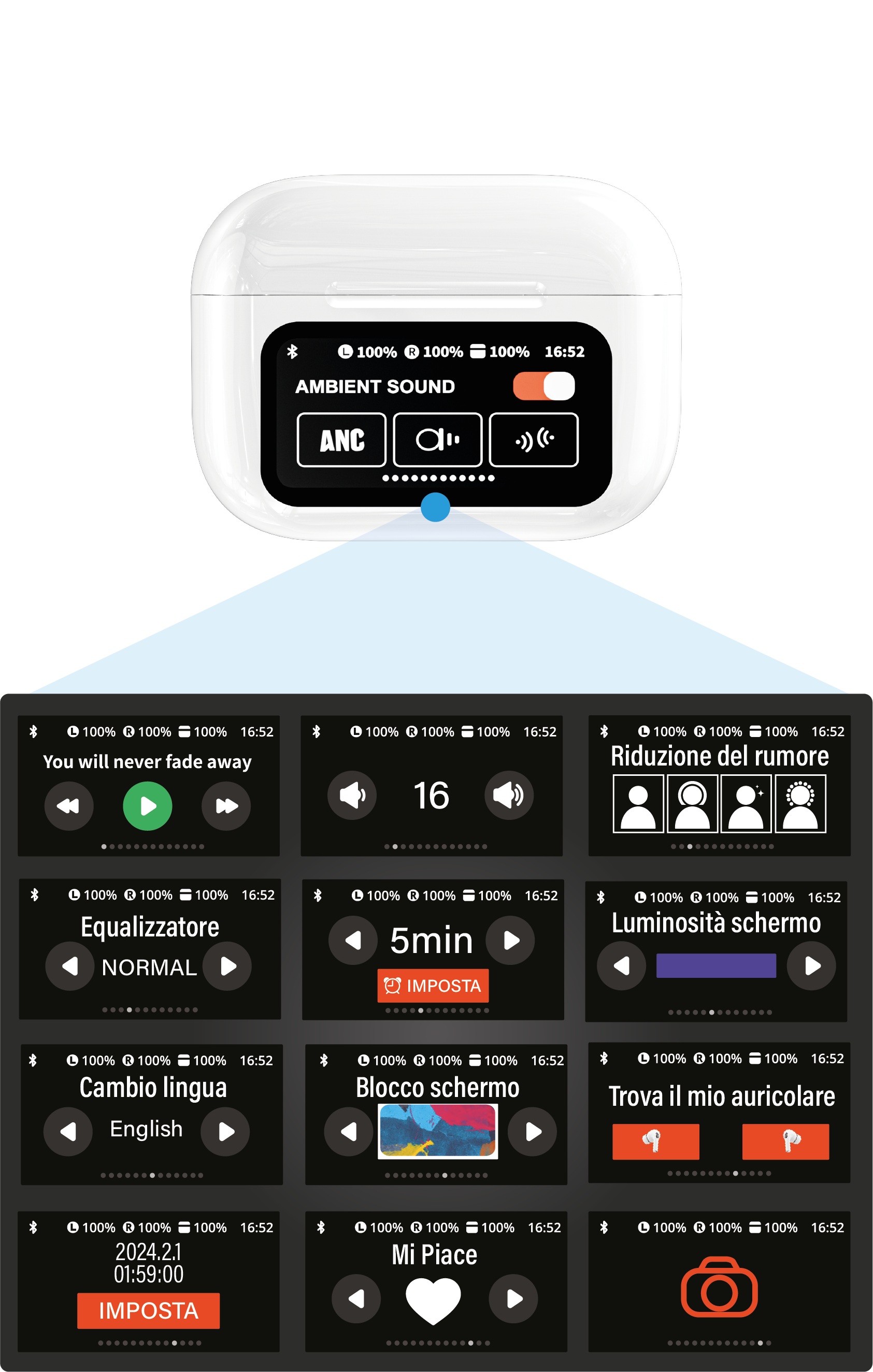 Questo display fornisce agli utenti informazioni in tempo reale sulla durata della batteria, sullo stato della connettività e altre notifiche essenziali. L'interfaccia intuitiva ti assicura di essere sempre informato sullo stato del tuo dispositivo senza dover controllare costantemente lo smartphone.